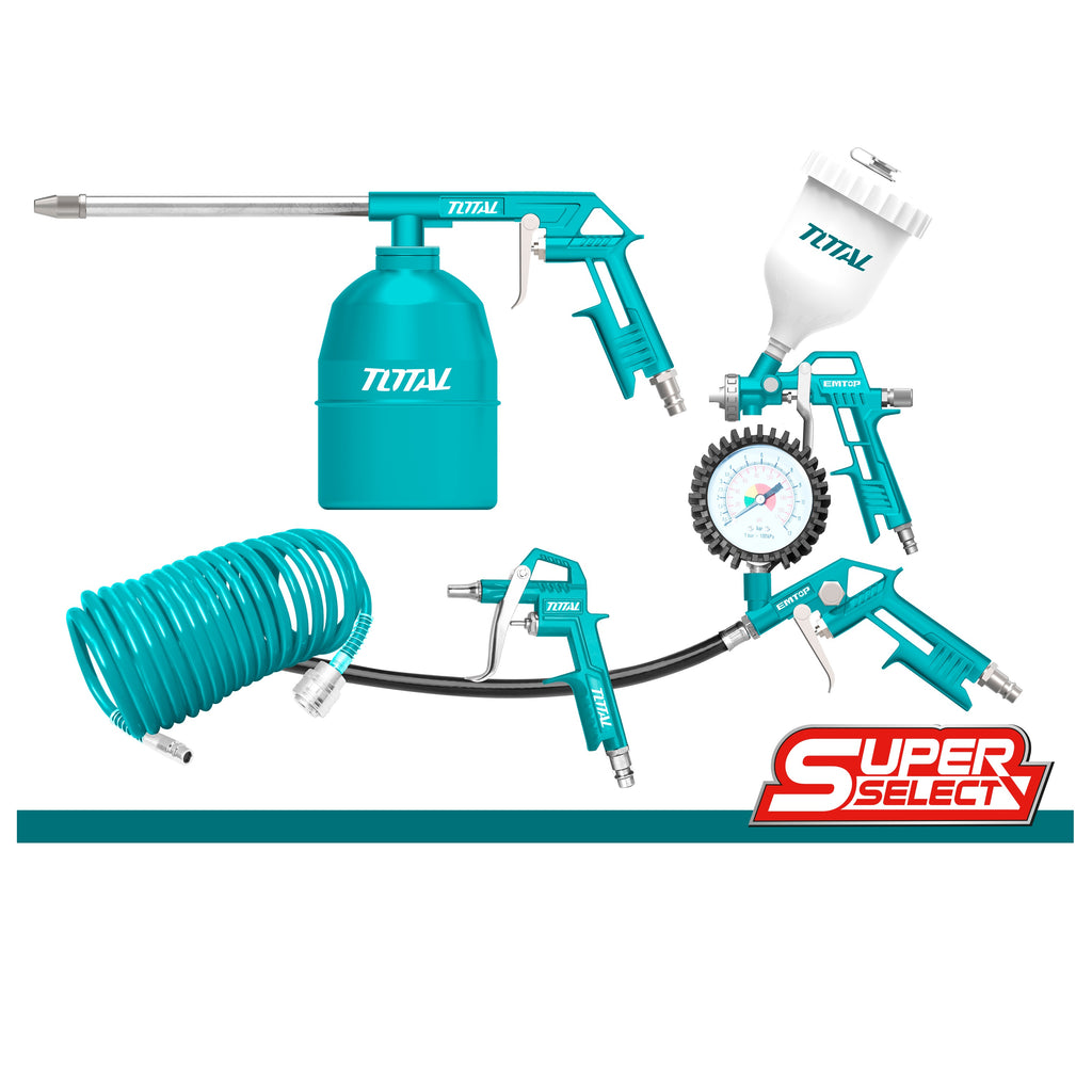 Juego de herramientas neumáticas de 5 piezas. Incluye: Manguera de aire para compresor, Pistola de aire, pistola spray para pintar, pistola spray para fumigar, y pistola para inflar llantas.