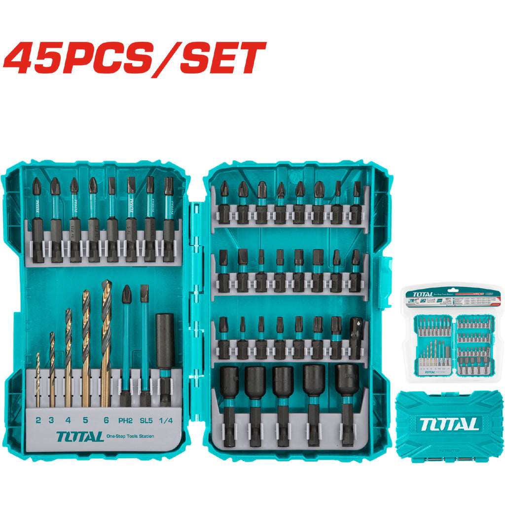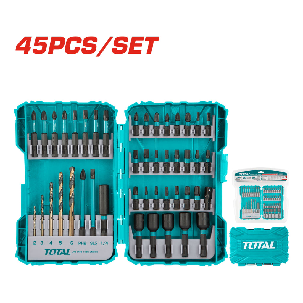 Juego de puntas de destornillador de impacto de 45 piezas para Taladro. 8 brocas de destornillador de impacto de 50 mm. 24 brocas de destornillador de impacto de 25 mm. 2 brocas de destornillador de impacto de 89 mm. 5 brocas HSS 2,3,4,5,6, mm. 5 tuercas magneticas de 48 mm 6,7,8,9,10mm. Trae un Mango para las piezas de destornillador.