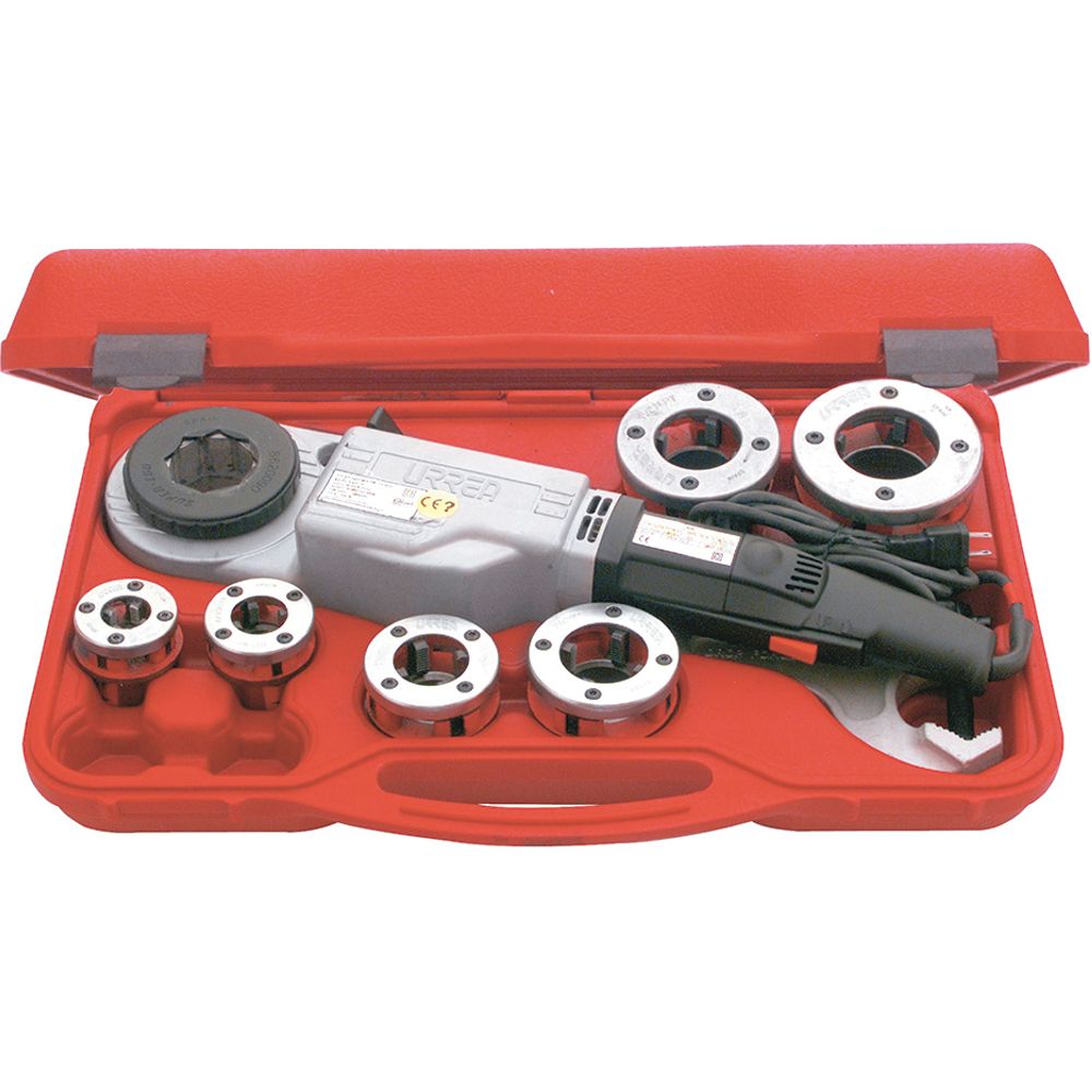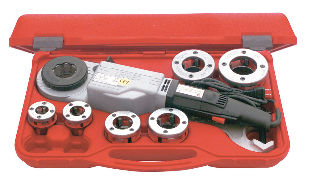 -Juego de tarraja eléctrica para tubo 8 piezas Urrea. -Carcasa de aluminio aleado. -Palanca de inversión de giro. -120v, 60hz, 10 a, 25rpm, 900w. -Palanca de inversión de giro. -Capacidad De Roscado: 1/2'''' A 2''''