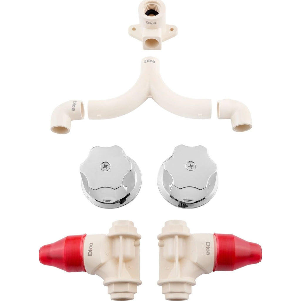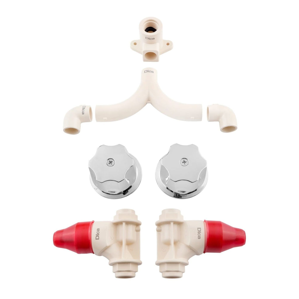 El empaque incluye codo oreja 90°, bigote CPVC, dos codos laterales 90° CPVC, dos llaves de empotrar (derecho e izquierdo) con manerales y chapetón metálicos cromados de cartucho cerámico ¼ de vuelta