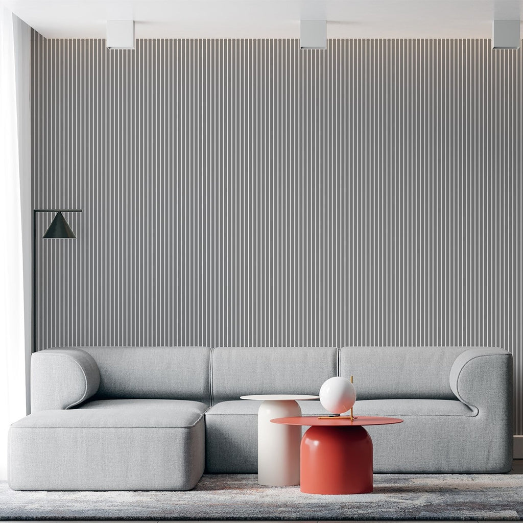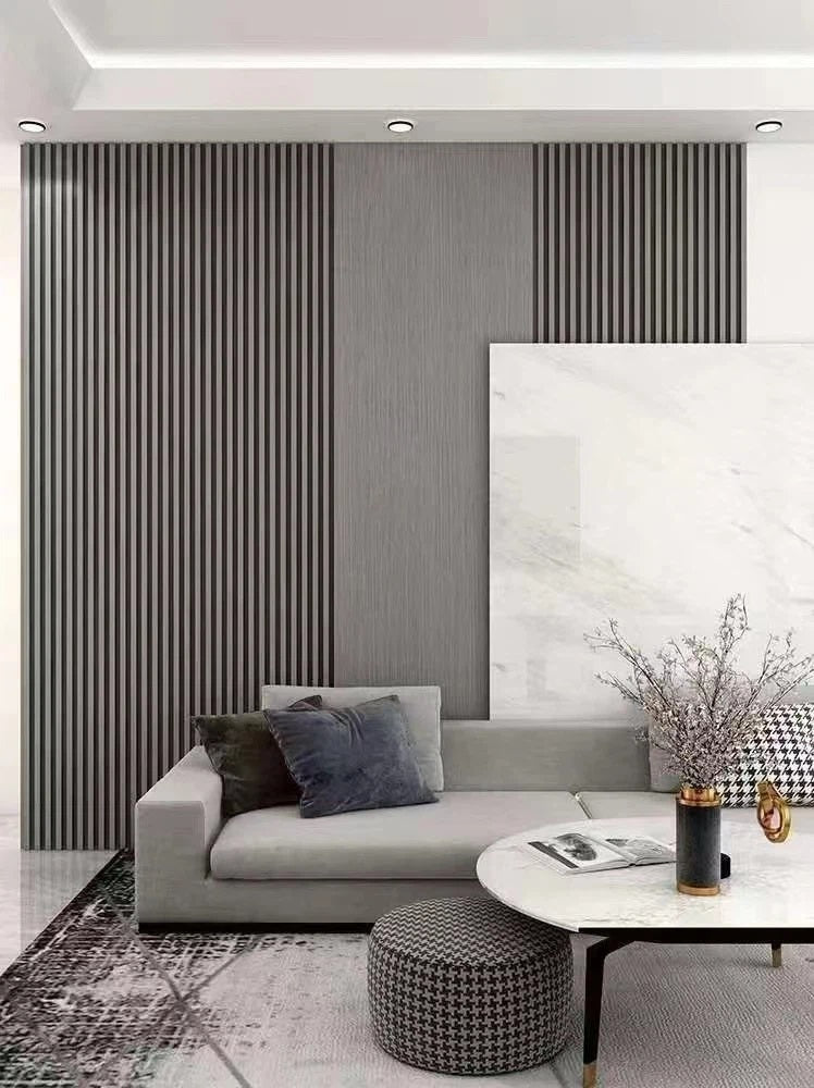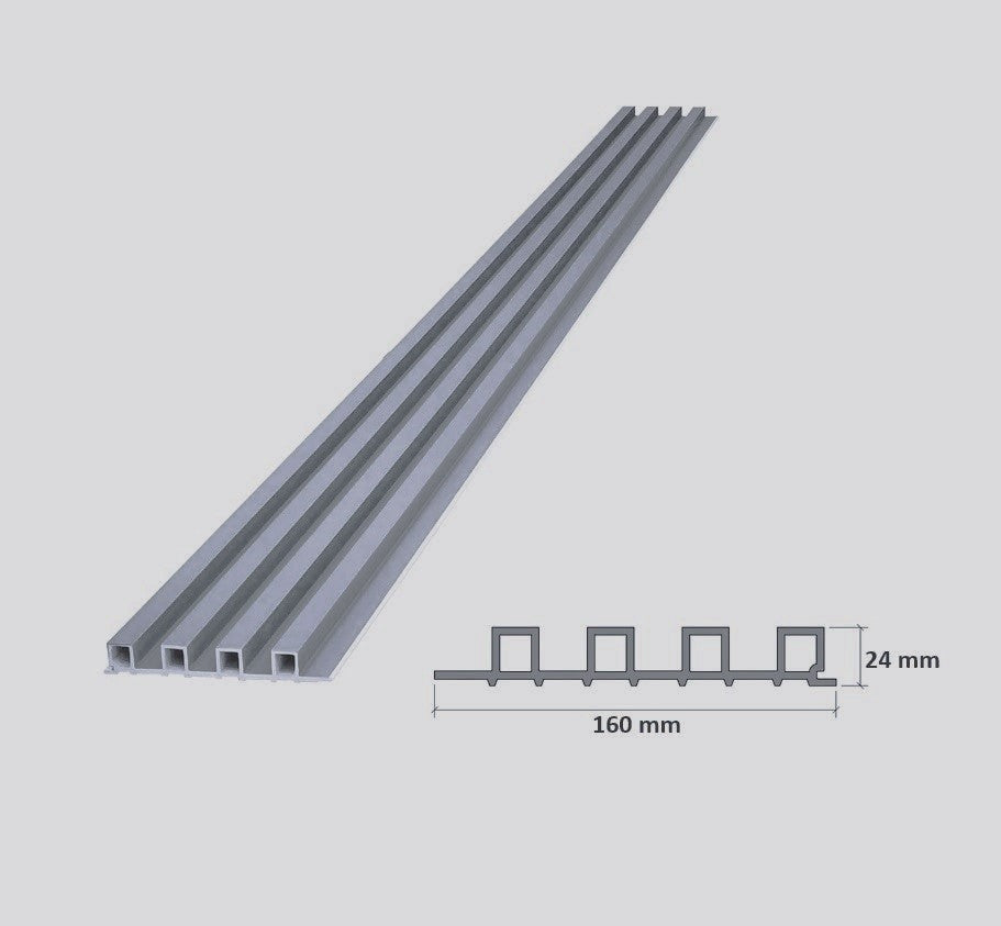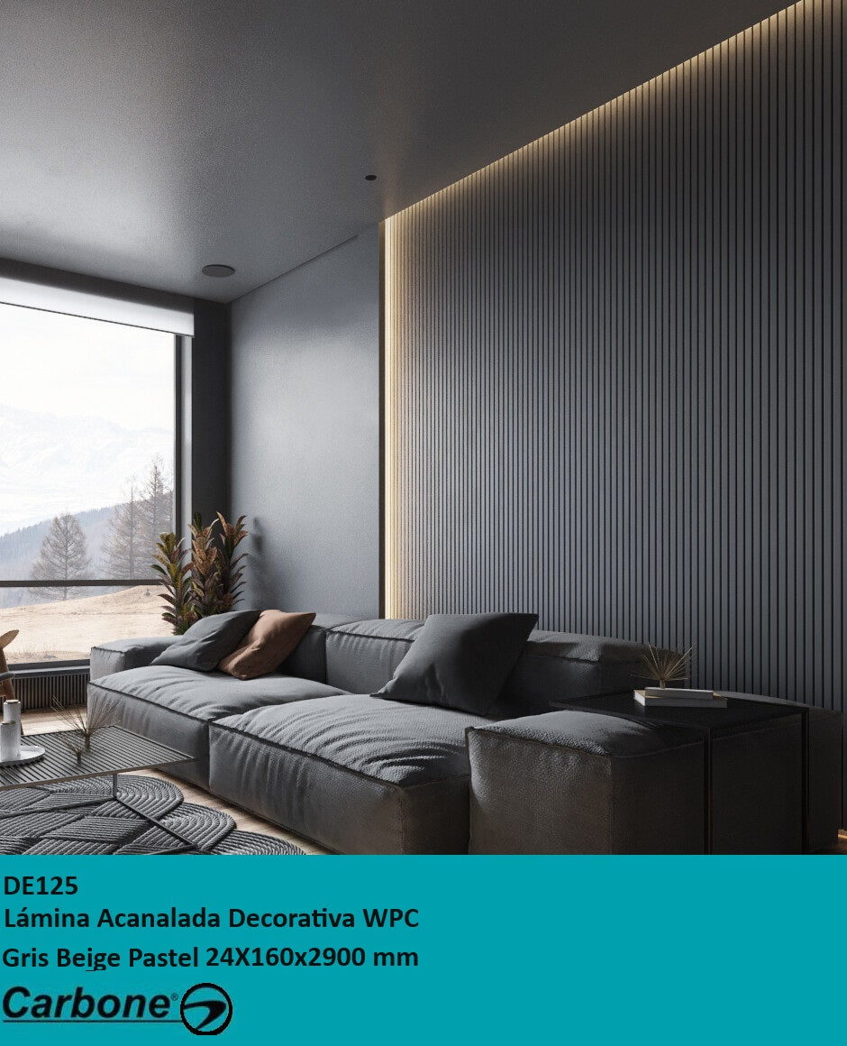 Lámina acanalada decorativa WPC Gris Beige Pastel 24x160x2900 mm - Compuesta por madera y PVC resistente al calor, humedad, y arañazos.