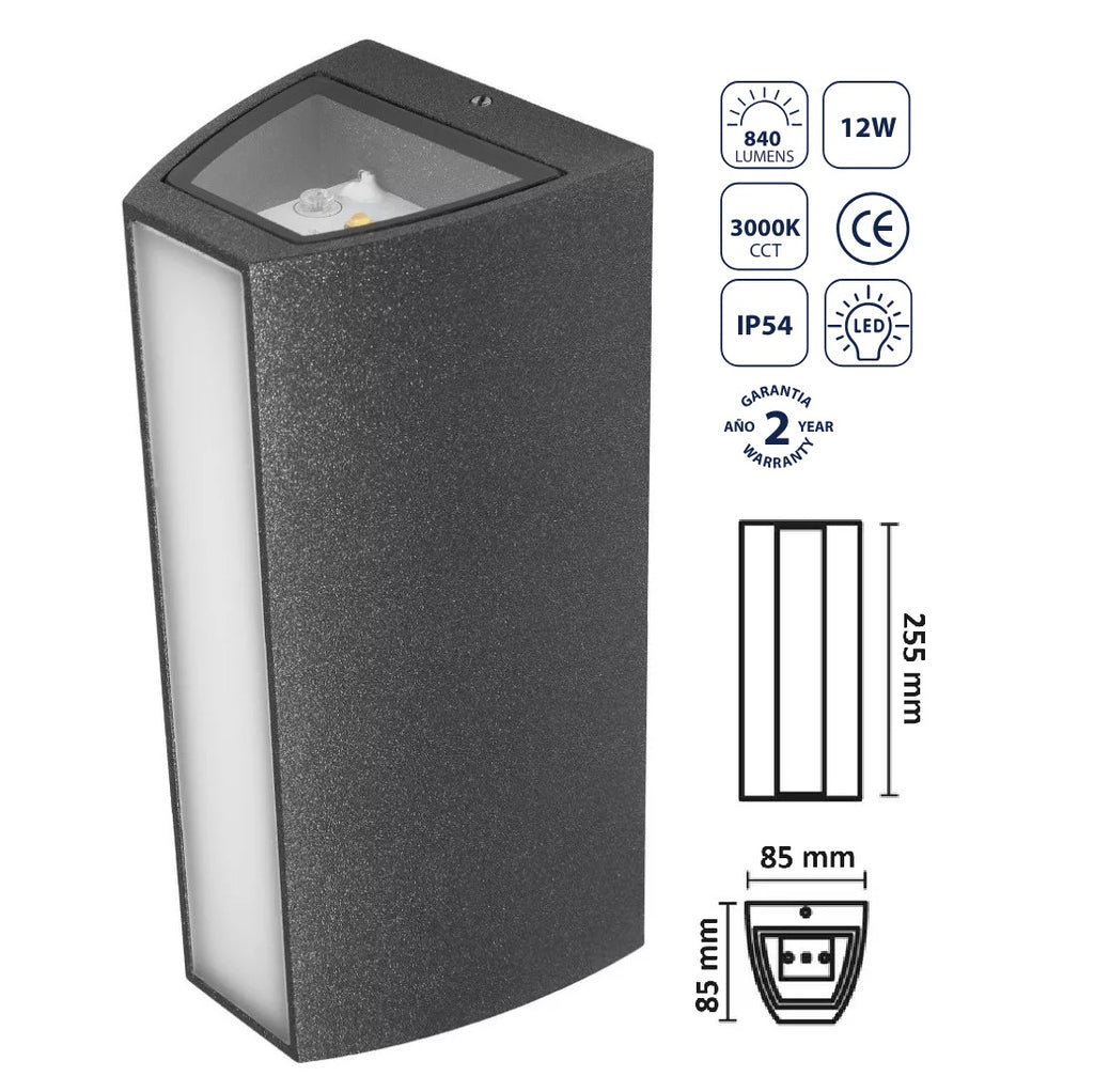 LAMPARA DE PARED EXTERIOR NEGRA LED 12W 30K lámpara de pared exterior negra con tecnología LED, 12W de potencia y 3000 K de temperatura de color calida y 840 lumens , es una opción eficiente y versátil para iluminar áreas exteriores, proporcionando una iluminación brillante y de bajo consumo energético.Tamaño de 85*255 milimetros, material de aluminio, voltaje 110-240V 50-60Hz.