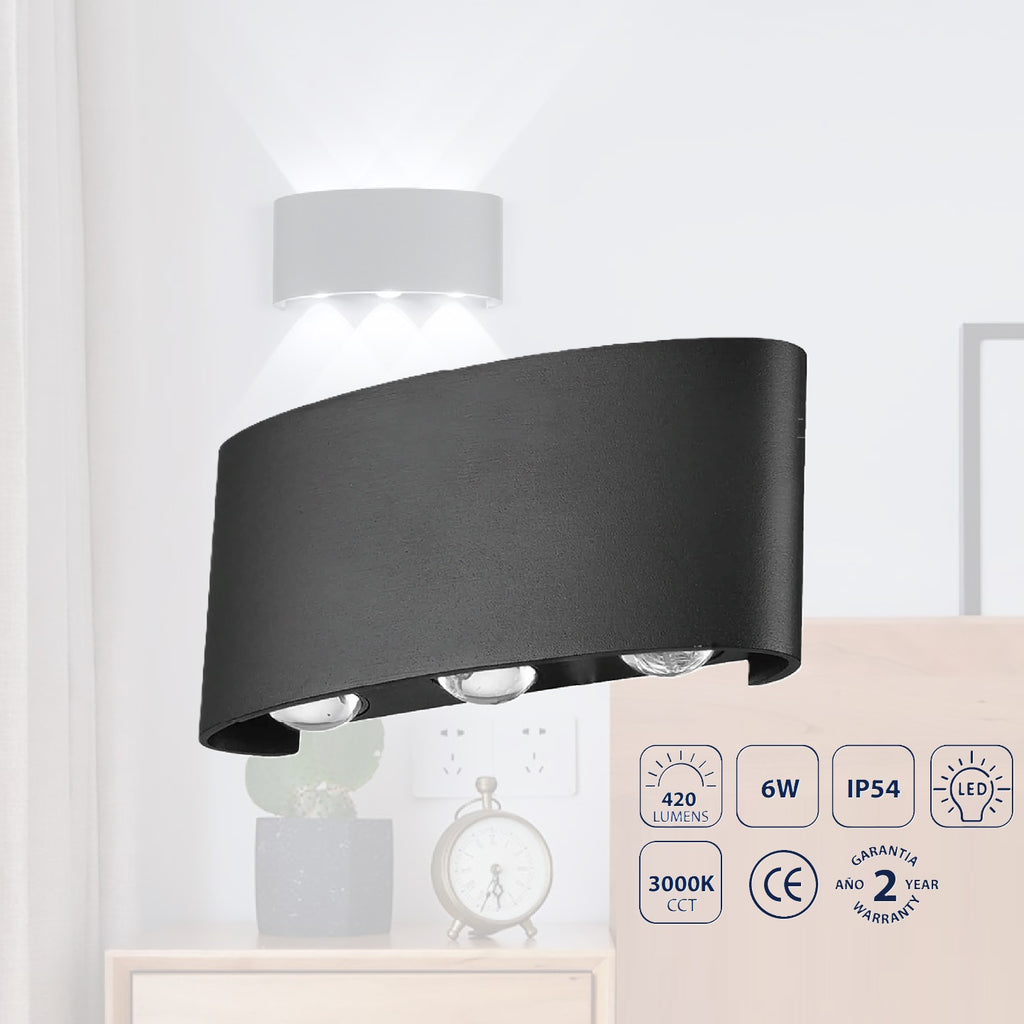 LAMPARA DE PARED EXTERIOR NEGRA LED 6W 30K lámpara de pared exterior negra LED de 6W y 420 lumens con una temperatura de color de 3000K calida, es una excelente opción para iluminar y embellecer áreas exteriores con una luz cálida y eficiente. Su diseño robusto, eficiencia energética y facilidad de instalación la convierten en una elección práctica y estilizada para cualquier espacio exterior. Tamaño de 170*80 milimetros, voltaje 110-240V 50-60Hz, material de aluminio. Esta lámpara es ideal para iluminar áreas exteriores como entradas, porches, terrazas, jardines o patios, proporcionando no solo funcionalidad sino también realzando el aspecto estético del espacio exterior.