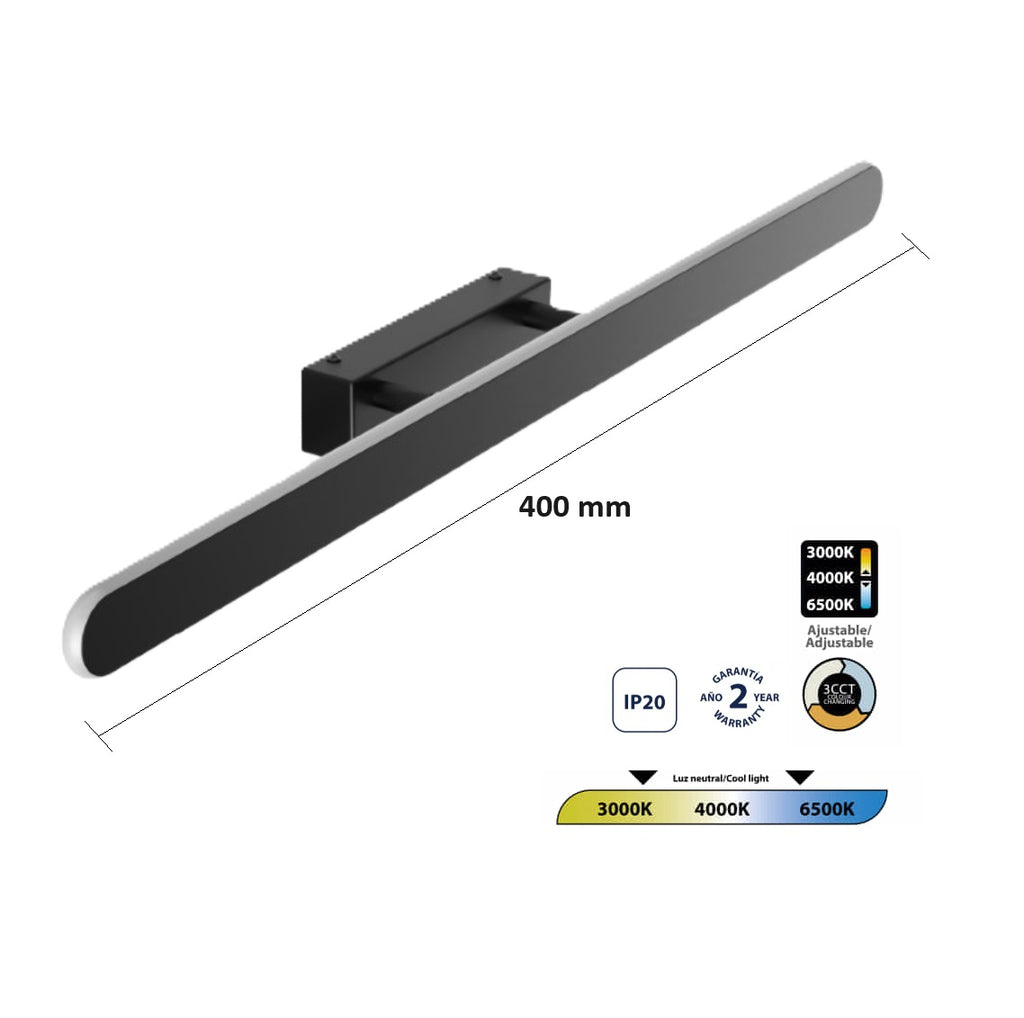 Lámpara de pared LED negra de 18Watts, 1500 lumens con CCT (temperatura de color cálida, neutra y fría) suena como una excelente opción para proporcionar iluminación eficiente y ajustable en cualquier espacio. La combinación del color negro con la tecnología LED ofrece un aspecto moderno y elegante que puede complementar una variedad de estilos. Material de hierro y aluminio de alta calidad con una dimension de 400x200x47mm, voltaje de 110-240v 50-60Hz.