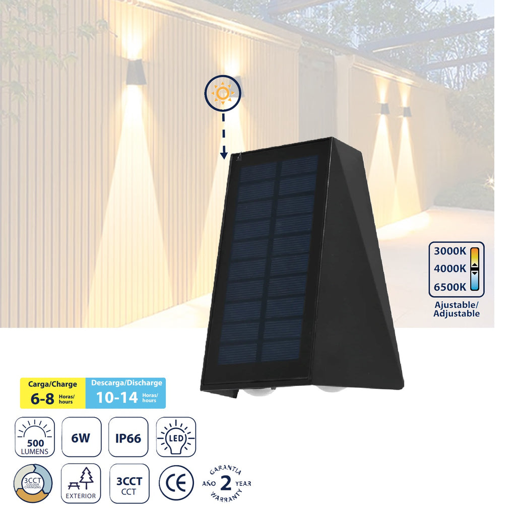 LAMPARA DE PARED SOLAR LED 6W CCT lámpara de pared solar LED en color negro con una potencia de 6Watts, 500 lumens y una temperatura de color de 3000K cálida 4000K neutra y 6500K fría, es una opción práctica y eficiente para la iluminación de áreas exteriores. Tamaño 160*120*85 milimetros, Batería 3.7 V/1 500mah, material ABS, tiempo de carga 6-8 horas y de descargar 10-14 horas, material ABS