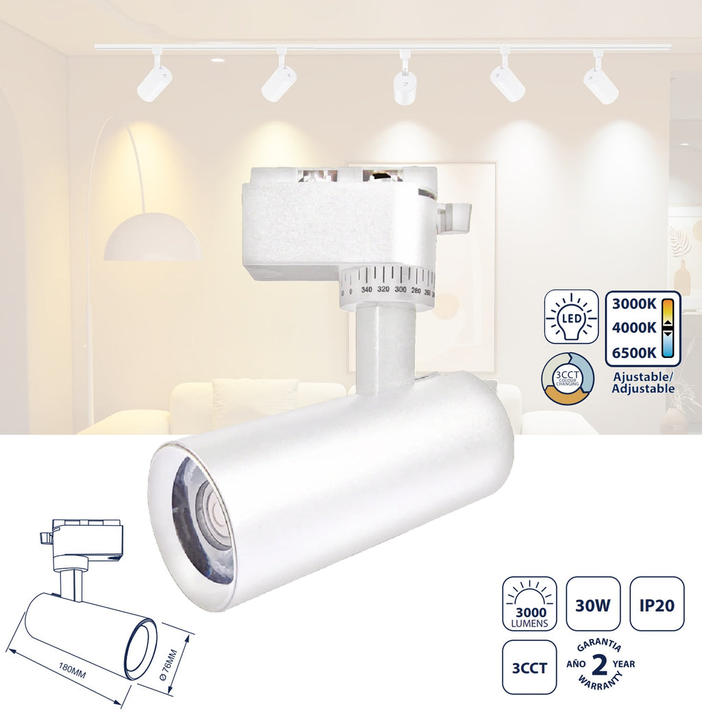 Lámpara De Riel LED 30W CCT 300Lm, Blanco. Iluminación Cambiable Y Diseño Atractivo. Foco De Carril LED.