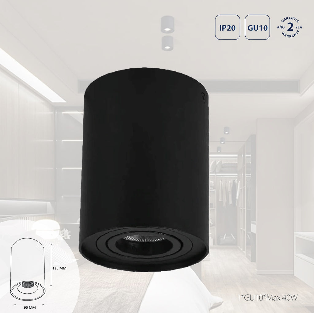 Lámpara De Techo Base 1XGU10 Negra Cilindrica. Ideal Para Interiores. Foco De Techo Redondo. No Incluye Bombillo