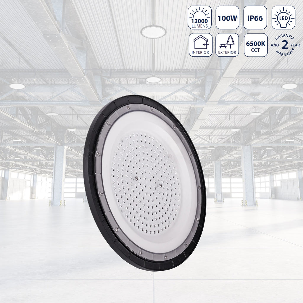 LAMPARA DE TECHO LED HIGH BAY 100W 6500K son una solución eficiente y efectiva para iluminar grandes espacios interiores con techos altos, proporcionando una iluminación potente, uniforme y duradera mediante la tecnología LED. Medias de 257*257*30 milimetros con luz fría, Voltage de 110-277V 50-60Hz con material de Aluminio de alta calidad para dispersar las altas temperaturas. Posee 100 Watts y 12000 lumenes.