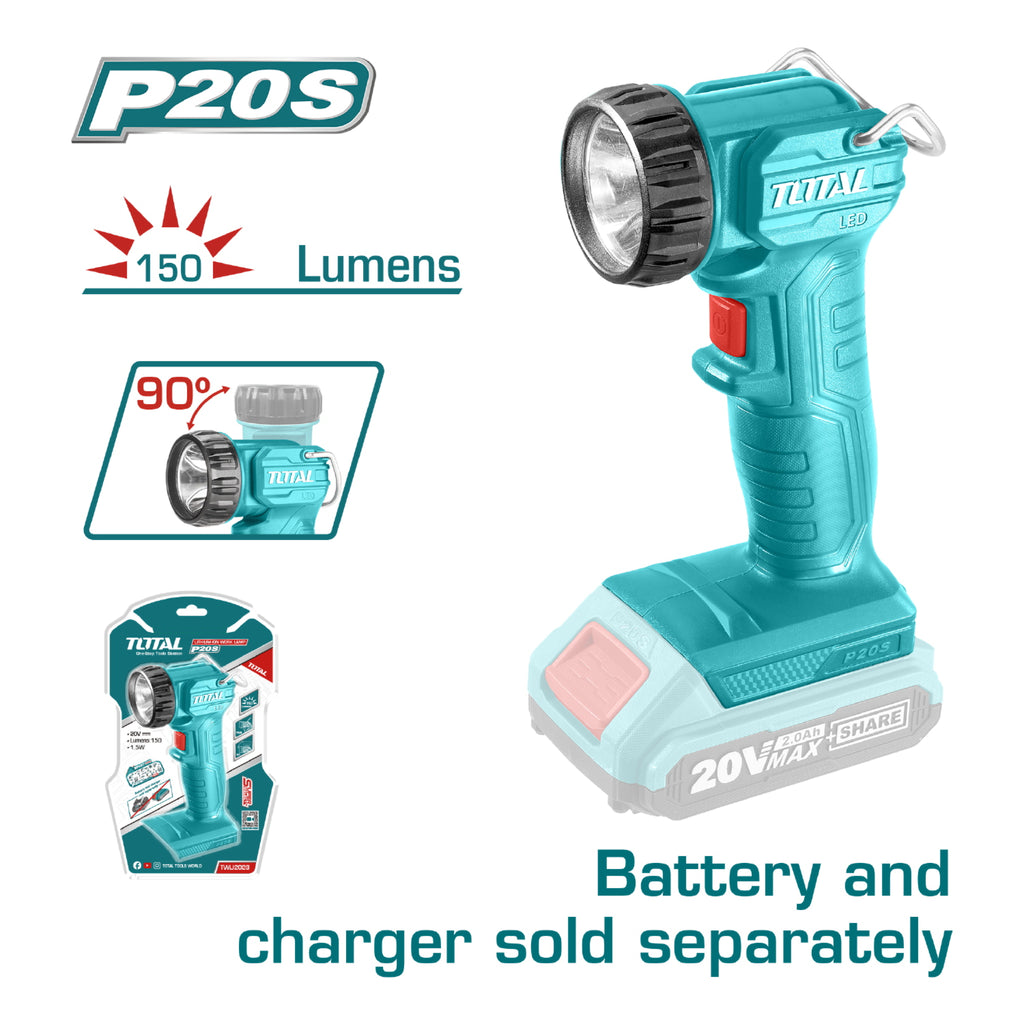 Lampara de trabajo inalámbrica litio 20V. 150 +/- 10% lumens. Led 1.5W (2 años). Marca Total. NO incluye cargador ni baterías.