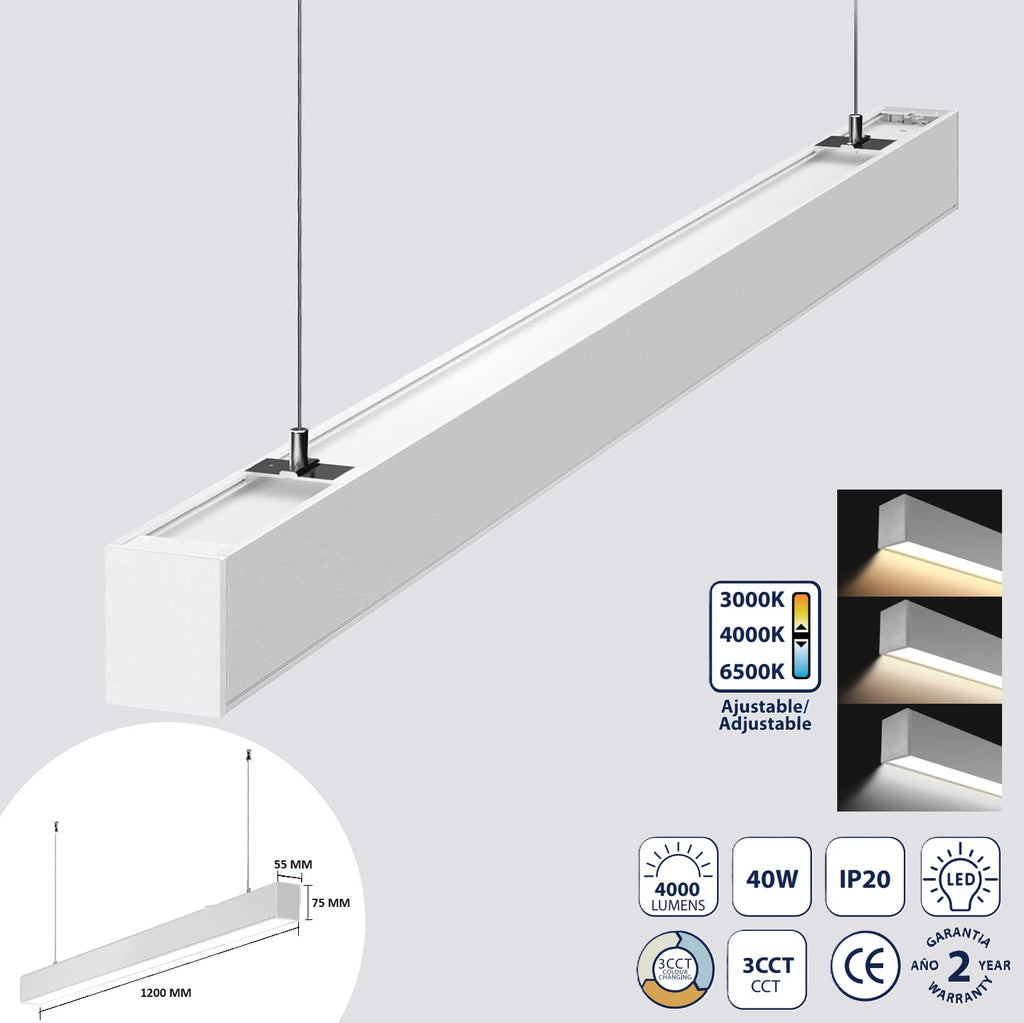 LAMPARA LINEAL LED BLANCA 40W CCT son una forma de iluminación que ofrece la capacidad de ajustar la temperatura de color para adaptarse a diferentes ambientes y necesidades de iluminación.Opción flexible y versátil para proporcionar iluminación ajustable en una variedad de entornos, ofreciendo eficiencia energética, control de iluminación y calidad de luz mejorada. Medias de 1200*55*75 milimetros , material de aluminio y plástico, posse una intensidad de watts de 40W y 4000 lumenes con tonos cálidos, neutros y fríos. Voltaje de 100-277V 50-60Hz. Lámpara de color blanco con metodo de uso colgante, superficie y recesado.