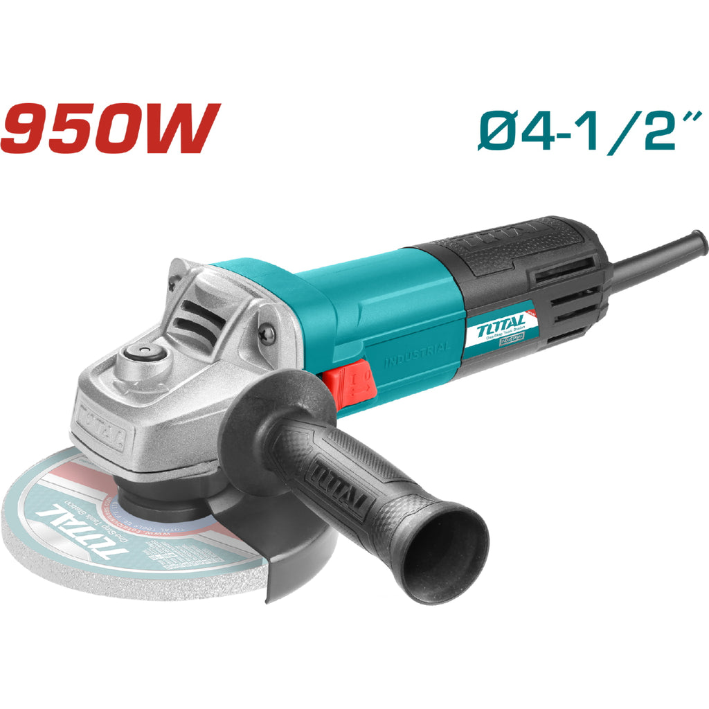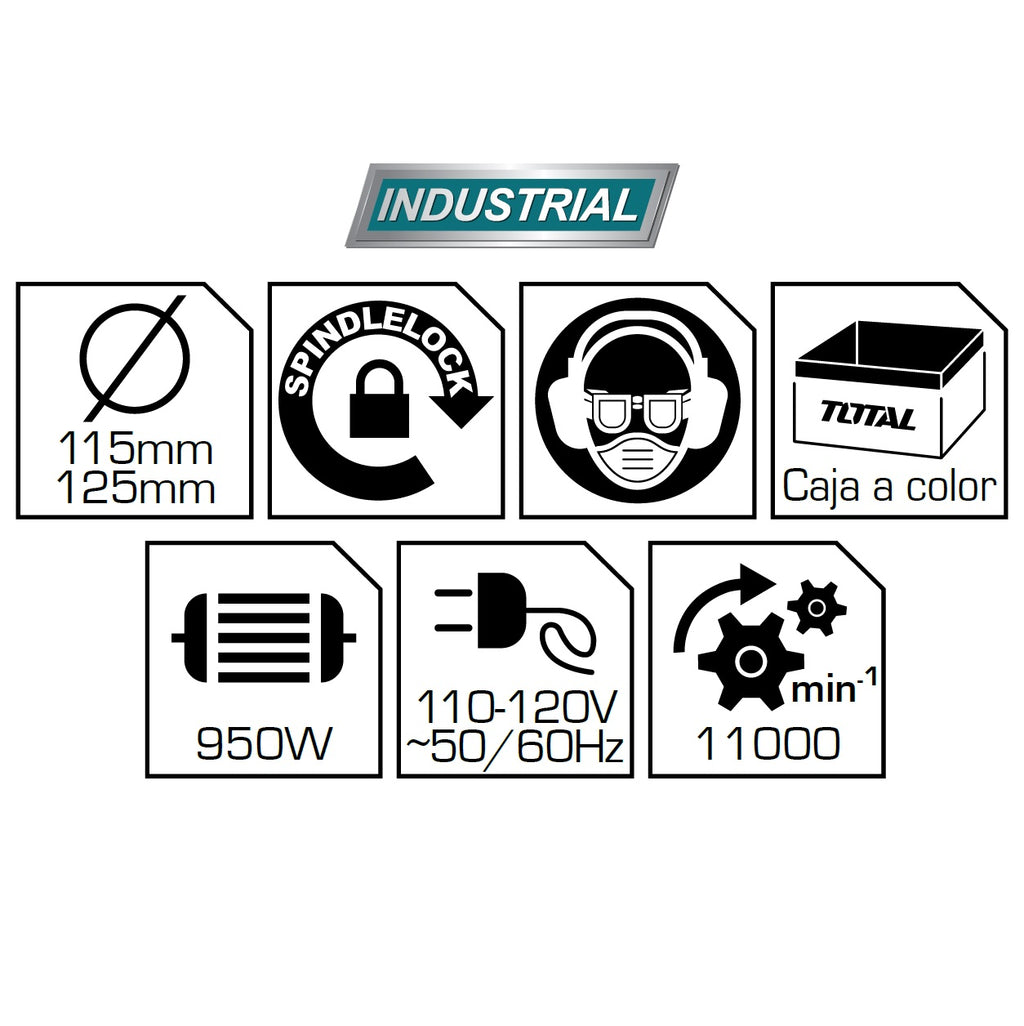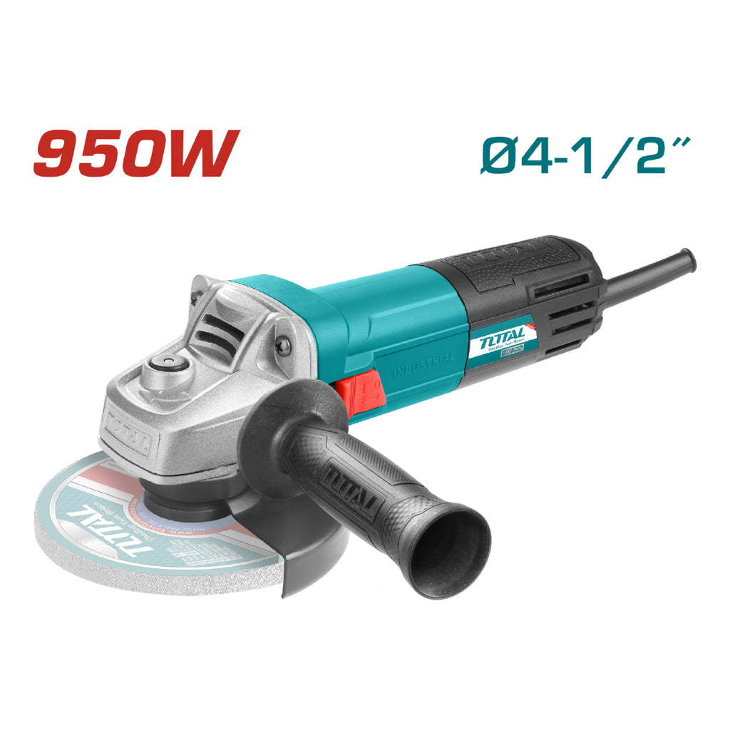 Lijadora angular de 4 1/2'' Total 110V-120V~60Hz 950W. 5/8''-11 UNC , 11000 rpm (1año). Eje enroscado de 5/8 - 11 UNC con spindle lock que permite cambio de disco fácilmente. Mango auxiliar y llave incluidos con la herramienta.