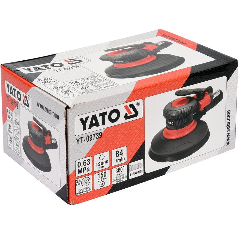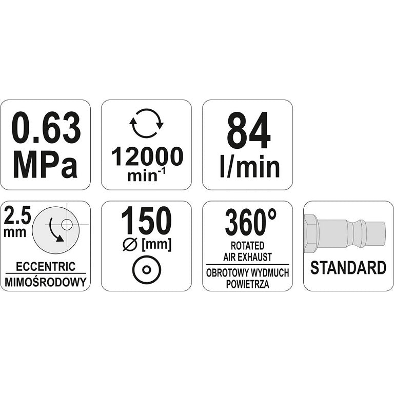 Lijadora Orbital Neumatica Profesional Excentrica. Con Conector para Aire Comprimido. Diametro 150 mm. Oscilacion de trabajo 2.5 mm. Presion de Trabajo: 0.63 MPa. Soplado de Aire rotativo de 360°. Productividad de 84 L/min. Velocidad de Rotacion 12000 rp