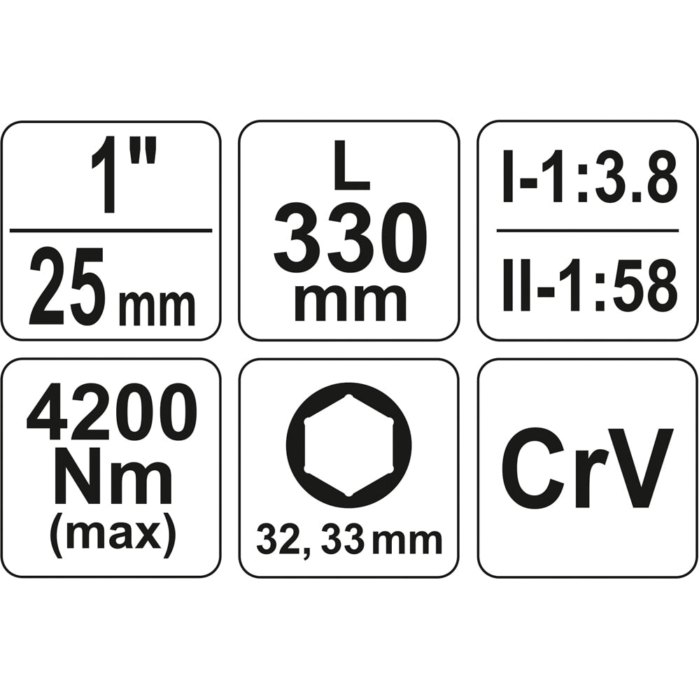 TIPO DE VELOCIDAD; LONGITUD: 330MM; RELACIÓN DE ENGRANAJES: 1: 3.8 Y 1: 58; PAR DE SALIDA: 4200NM; MATERIAL DEL CUERPO: CRV 40; SOCKETS: 32MM, 33MM