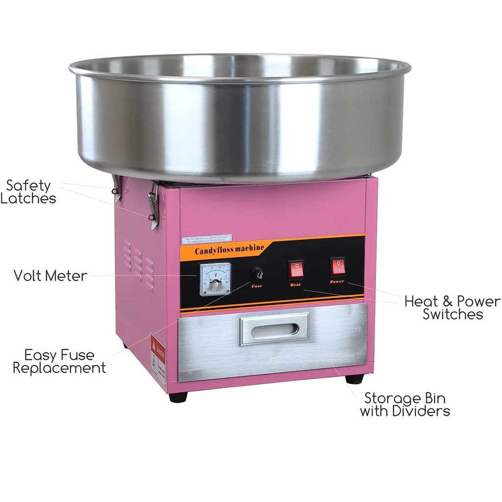 La máquina de algodón de azúcar es perfecta para uso comercial o fiestas, salas de juegos, recepciones de boda, e incluso reuniones familiares y sociales. Esta máquina de caramelo de algodón bombeará un flujo continuo de nubes de caramelo.