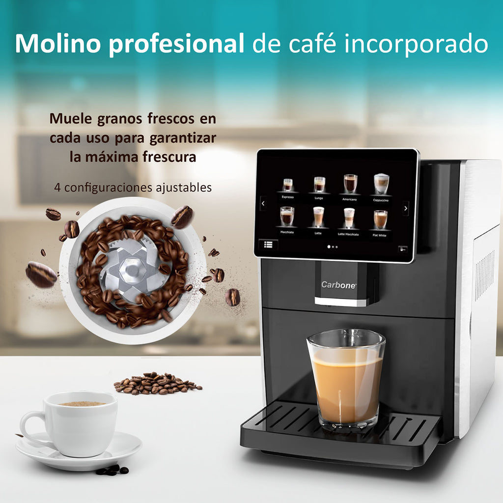 | Incluye | Máquina profesional automática de café, Molino de café, contenedor de agua, contenedor de leche externo, cuchara medidora y cepillo de limpieza |