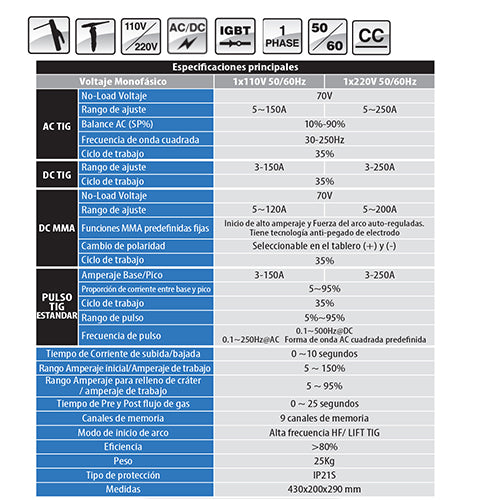 | Rango de ajuste DC TIG | 3-150A / 3-250A |