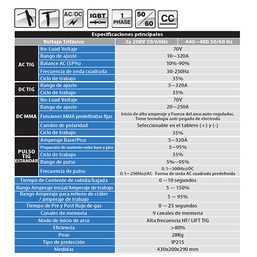 Esta máquina es ideal para el profesional que necesita un soldador AC/DC TIG bien equipado y potente, Nuestra Digitig320 AC/DC es una solución versátil. No sólo es versátil, tiene la potencia que se requiere en la industria pesada,arrojando 320 amperios de potencia de soldadura TIG y 250 amp en MMA. Usa entrada de trifásico dual 208 /440~480, con un ciclo de trabajo del 35%. La unidad está equipada con elementos como el pulso completamente