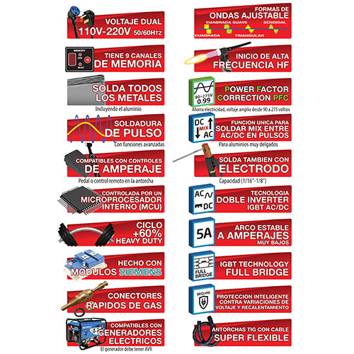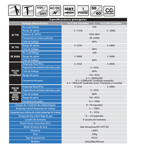 | Capacidad | IGBT INVERTER AC/DC HF-TIG (GTAW)/ DC MMA (SMAW) |