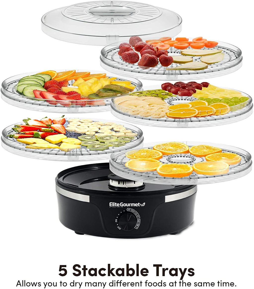 - Este deshidratador de alimentos está diseñado con 5 bandejas de secado de gran capacidad, que es suficiente para sostener la mayoría de los alimentos y crear un secado uniforme.