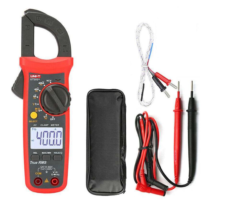 Medidor de abrazadera Pinza amperimétrica UNI-T UT202 diseñada para medir voltaje AC y DC, corriente AC, resistencia y temperatura, también permite realizar el chequeo de diodos y de continuidad. Protección contra sobrecarga.