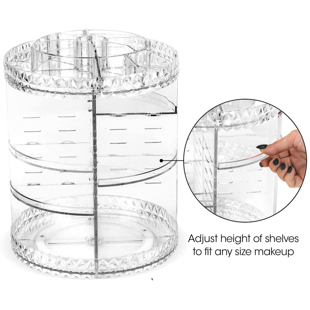 Mide 23.5cm de diámetro y 34cm de altura cuando se monta; se adapta a todas tus joyas, cosméticos, brochas de maquillaje, productos para el cuidado de la piel, pintalabios, esmalte de uñas, delineador de ojos, fragancias y más en contenedores extragrandes, ahorra espacio en la encimera de tu baño o habitación, mantiene tu tocador ordenado.