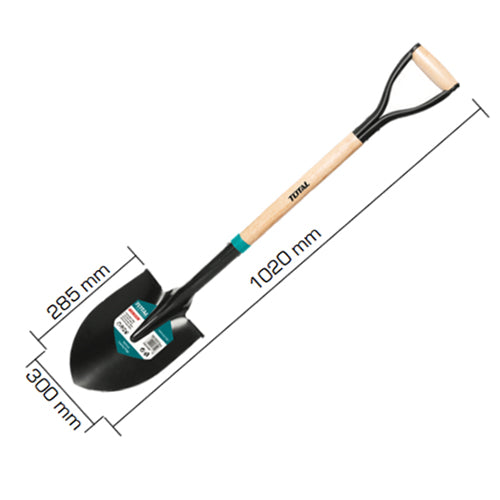 Pala de punta con Mango de madera 1020mm. Pala 285mm x 300 mm. Material: Acero al Carbon.