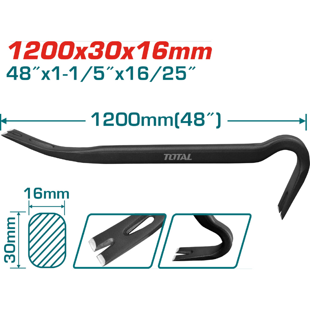 Pata de Cabra de 48''(1200mm) X 1-1/8''(29mm) X 19/32''(15.0mm). Mango Ovalado con Muesca (30°,68°). Material: Acero Al Carbono, Tratado Termicamente.