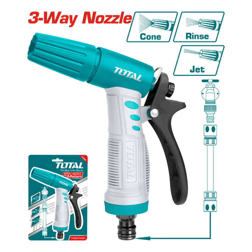 Pistola Boquilla de Agua de plástico Ajustable a 3 vias. Con conector rápido de 3/4''. Material de plástico ABS y resistente a alto impacto con TPR cómodo y suave agarre. Palanca de Nylon.