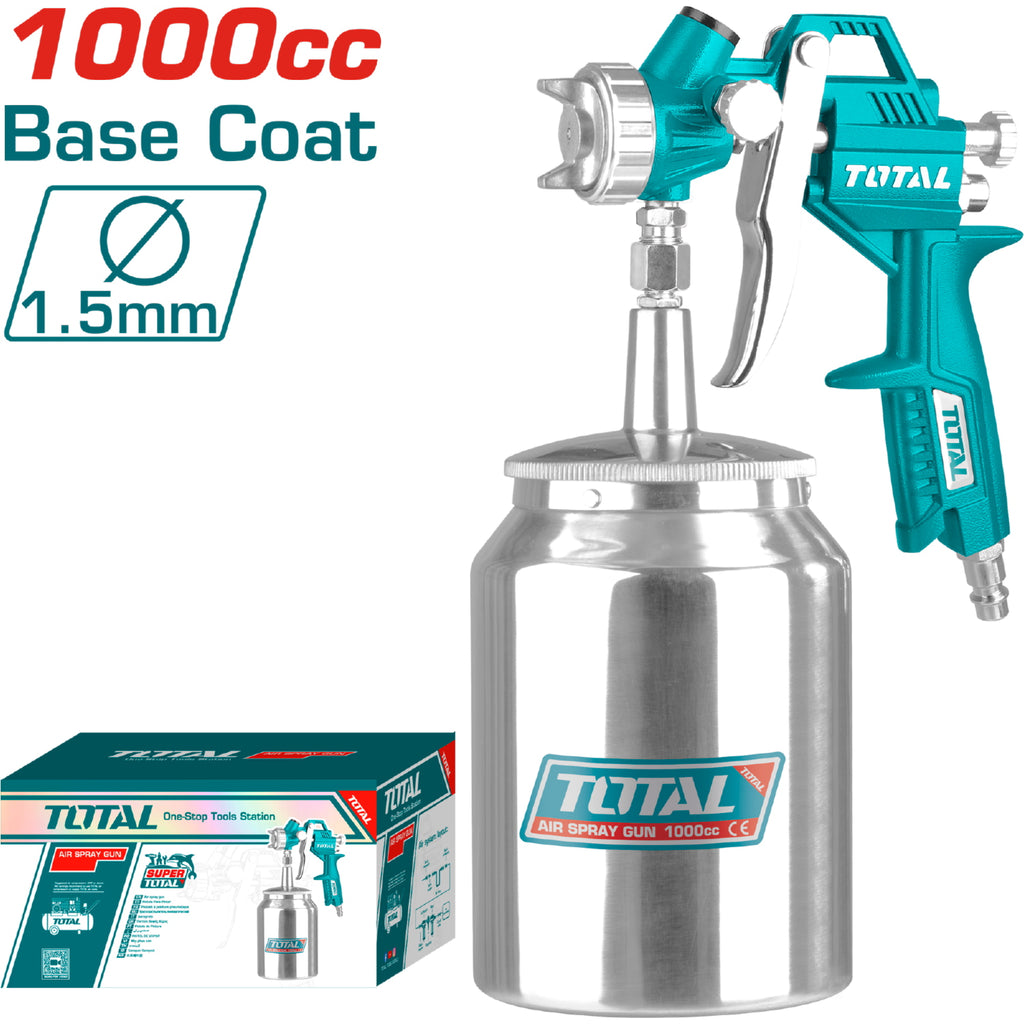 Pistola de aire para pintar. Boquilla 1.5 mm. Ancho de spray regulable entre 140-180 mm. Capacidad 1000cc. Usado para capa base. Presion opertiva 3-4 bar. Consumo 4.2-7.1cfm