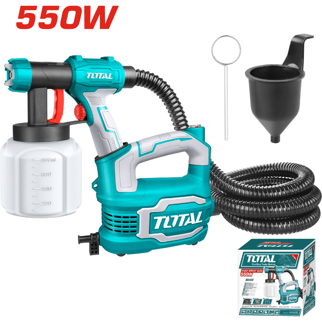 Pistola rociadora, Voltaje 110-120V~50/60Hz, Potencia de 500W, Presión de pulverización: 0.1-0.2 Bar. Flujo máximo: 380 ml / min. Viscosidad máxima de la pintura 50DIN-s, Capacidad de envase 800ml, Cable de eléctrico de 2m, Incluye: Aguja de mantenimiento, Copa de medida, y Correa.