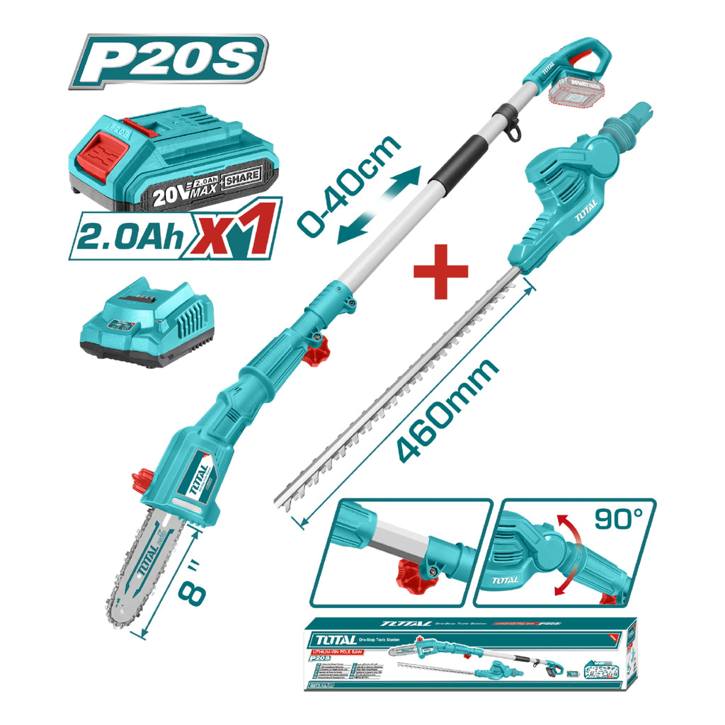 Podadora de extensión motosierra cortasetos de batería 20V (incluye cargador y batería).