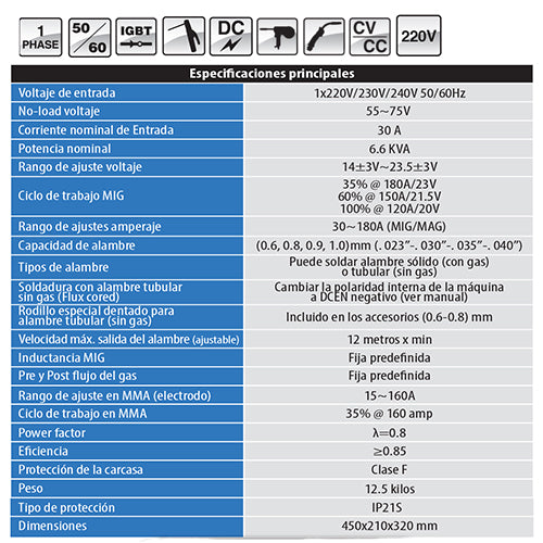 | Características | Suelda toda los metales incluyendo aluminio, Suelda desde 30 amp, Suelda también con electrodo, Suelda con gas o sin gas, Conectores rápidos de gas, Puede soldar en MIG hasta espesores de 3/8” en un solo pase, 5/8” en multipase y mínimo calibre 24 |