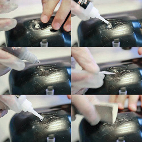 Relleno rapido y Pegamento reforzante ( 1 + 1 ). Para reparaciones dificiles, compuesto de dos partes (adhesivo y polvo) con capacidades unicas de refuerzo y relleno, reparando grietas, agujeros y huecos para que la superficie recupere su forma original