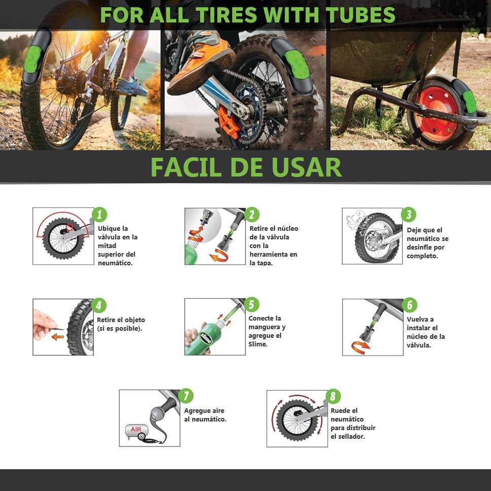 - Slime busca y sella instantáneamente pinchazos en tus tubos de hasta 1/8 pulgadas (0.118 in) utilizando la tecnología Fibro-Seal.