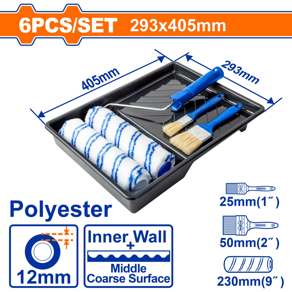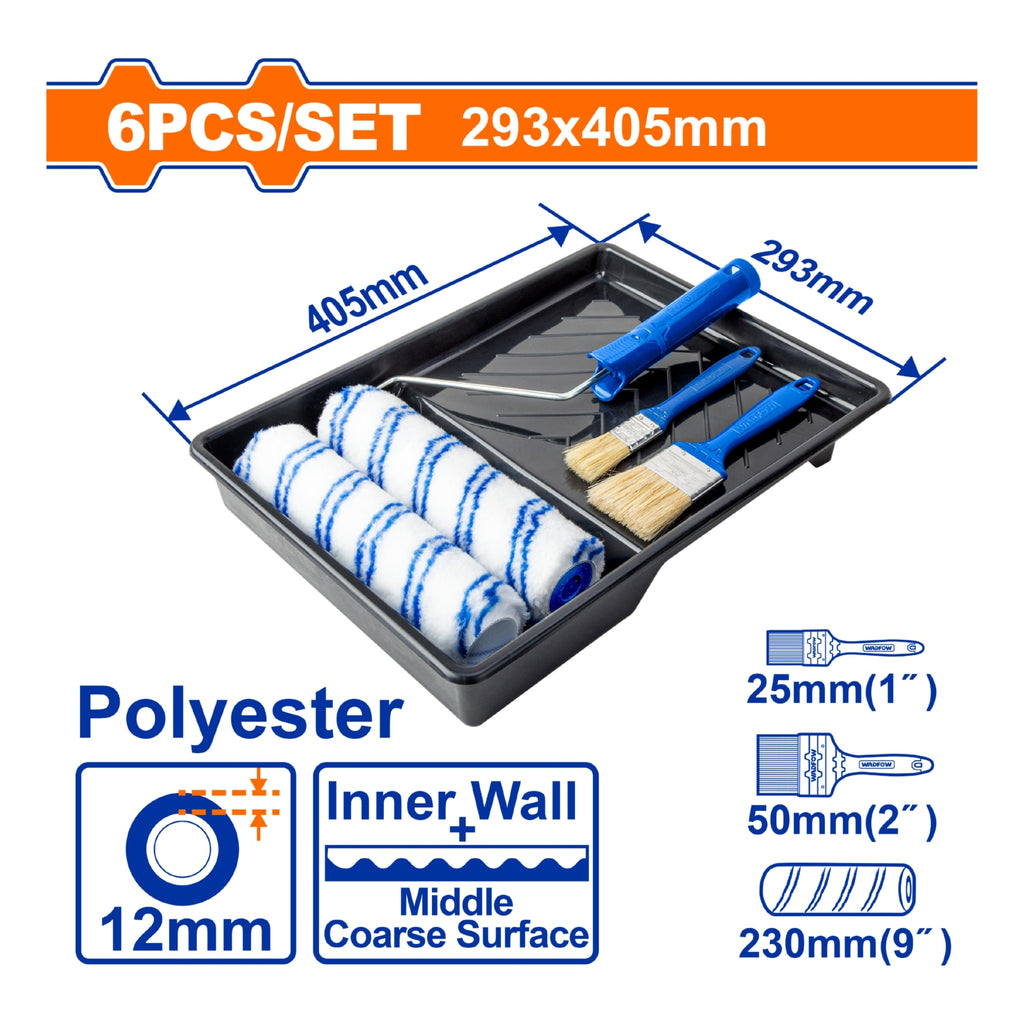 | Características | Rodillos, Brochas y Bandeja para pintar. Set de 6 piezas. Ideal para interiores. Poliéster. Incluye: 2 rodillos. 1 mango para rodillo. 230mm. Brochas de pintura, bandeja de pintura. |