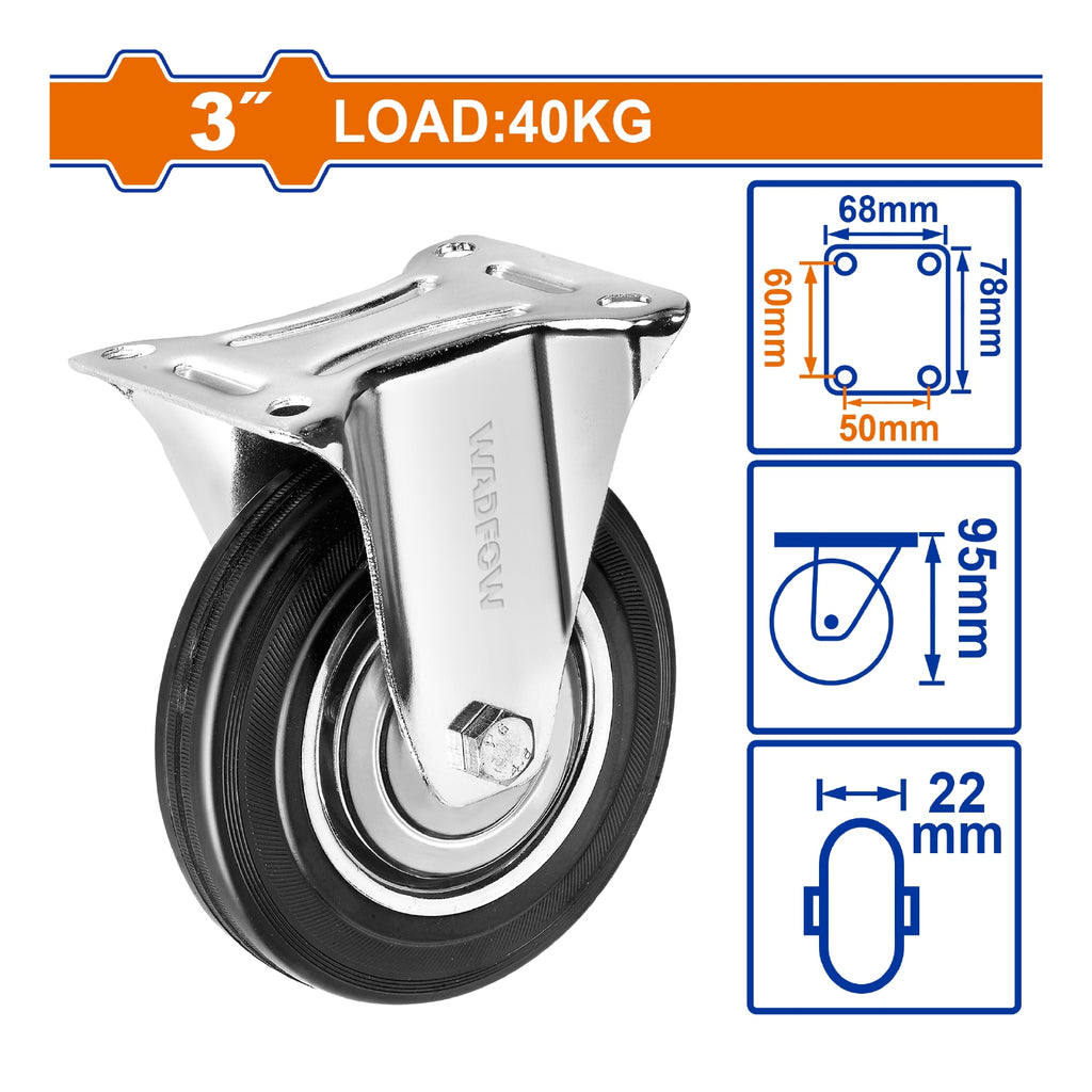 | Características | Material de la rueda:Acero + goma. Diámetro de la rueda: 3" (75 mm). Ancho de la rueda: 22 mm. Rodamiento: rodamiento de rodillos. Material del marco: chapa laminada. |