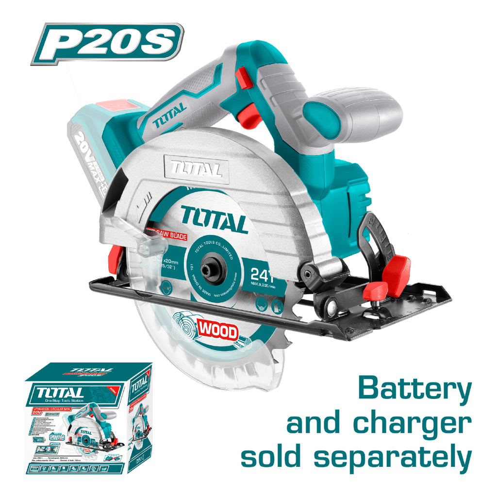 Sierra Circular de Batería de Litio 20V. Velocidad 4600 rpm. Capacidad de Corte a 45°: 38mm. A 90°: 55mm. Profundidad de Corte Ajustable. Bisel de Corte Ajustable. Incluye Disco de Corte de 165mm. No incluye Batería ni Cargador.