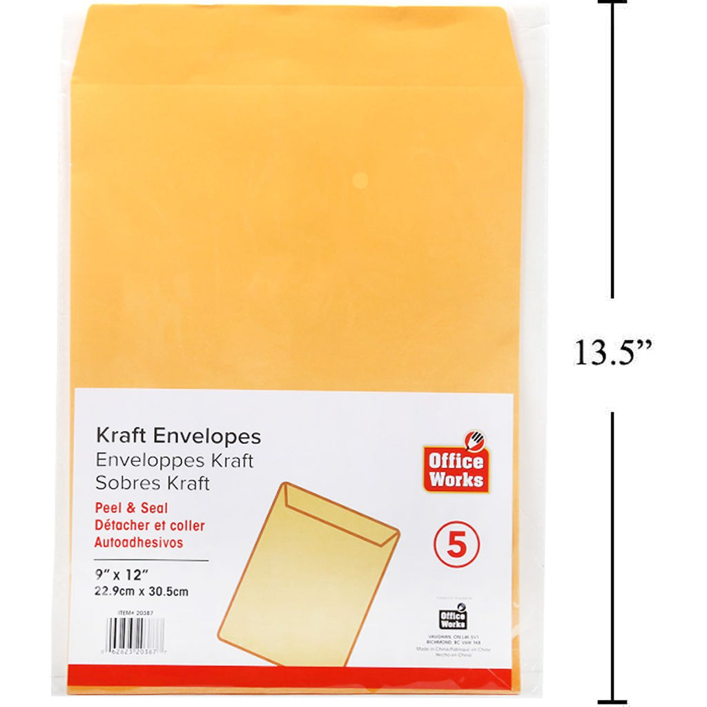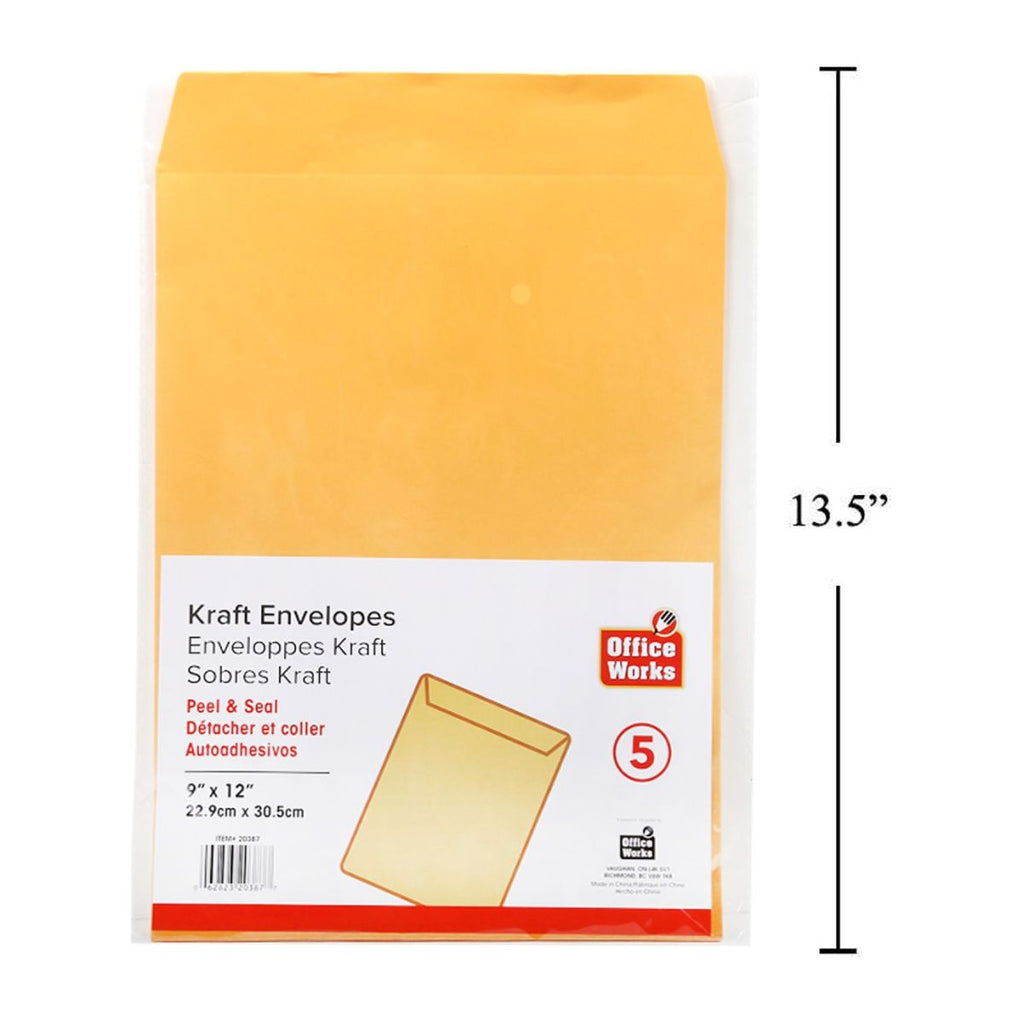 Sobre manila kraft despegable y sellado de 5 piezas, 9 x 12''