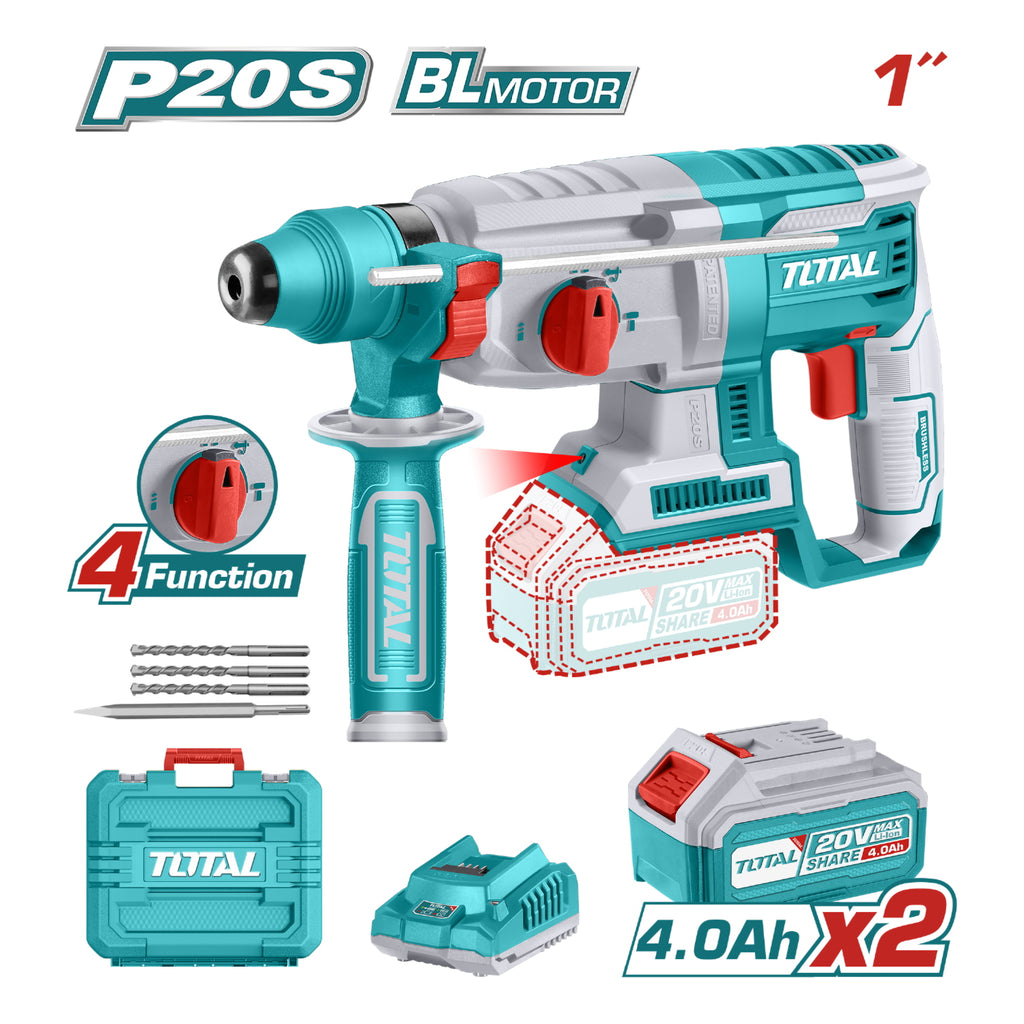 Taladro Rotomartillo 20V. Motor sin escobillas. Perfora concreto: 26mm. Incluye batería y cargador.