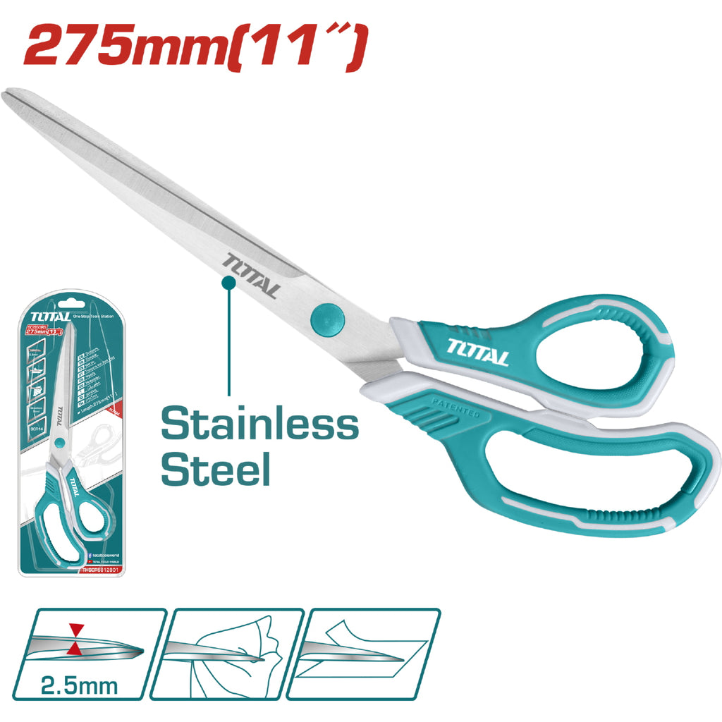 Tijera de 275 mm (11'') de Acero Inoxidable. Ancho de la Hojilla: 2.5mm. Con diseño de Mango ergonomico de superficie arenada.