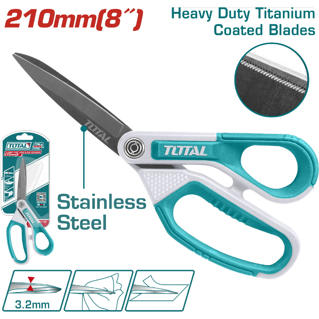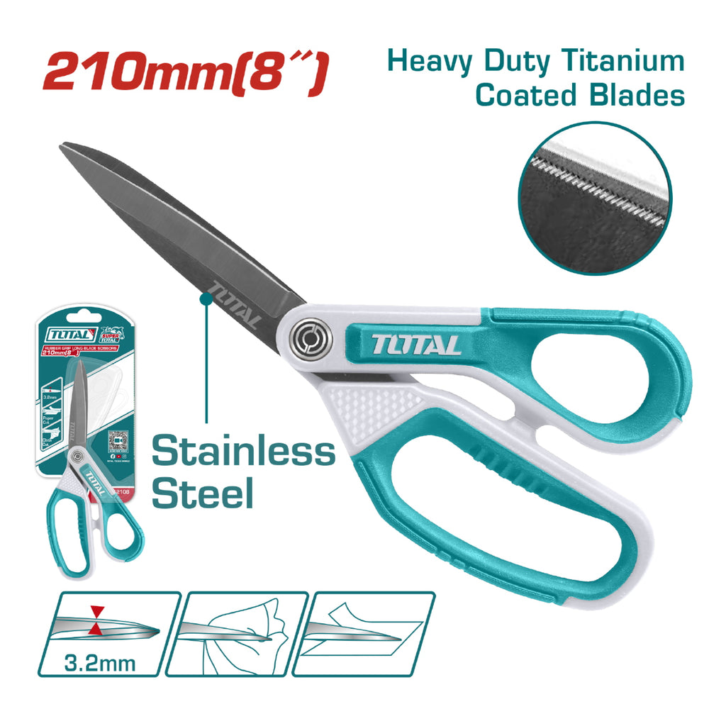| Características | Tijera de 8" de Acero Inoxidable. Ancho de la hoja: 3.2mm. Mango ergonómico de goma. Ideal para tela, plástico y cartón. |