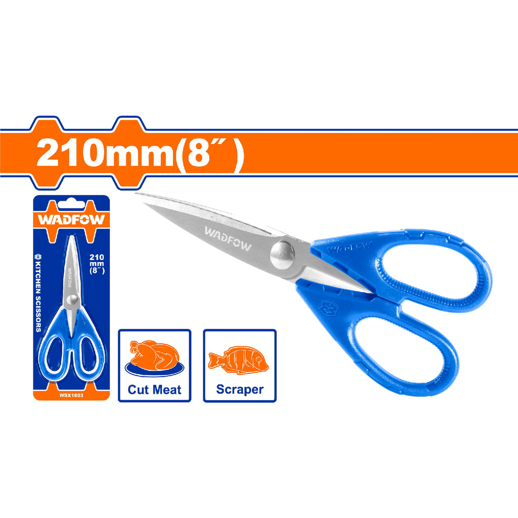 | Características | Tijera de Cocina 210 mm (8") de Acero Inoxidable. Material: Acero inoxidable. Espesor de la hoja: 1.8mm. Escala de corte, raspador. Diseño de Mango ergonómico de superficie arenada con diseño único. |
