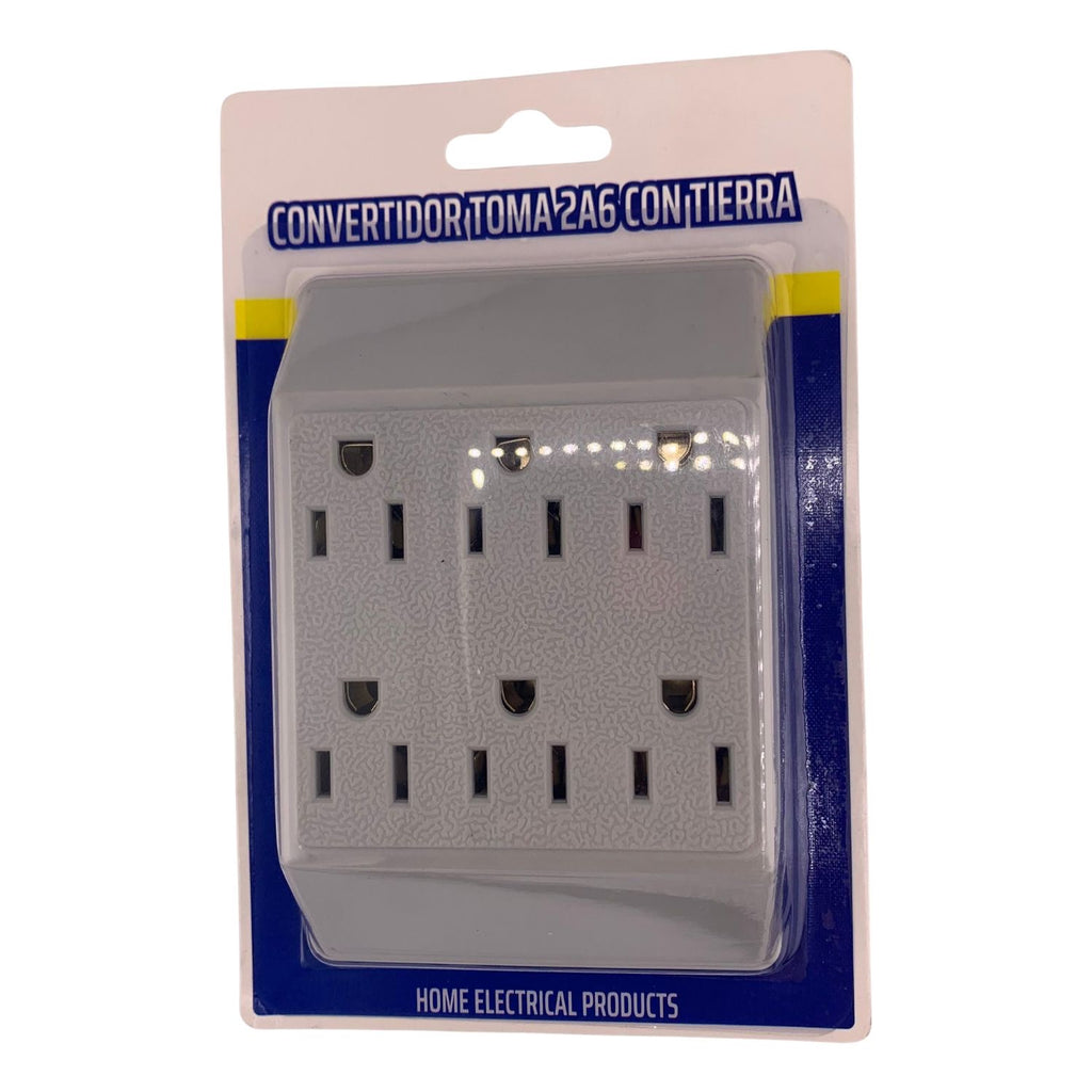 Toma Corriente de 6 Salidas Con Tierra. Uso Residencial e Industrial. Nema 1-15 P. 15A-125Volt. 60Hz - 3 Polos. Material de Plastico Rigido - Cobre. Color Blanco. Empaque en Blister Codigo de Barra
