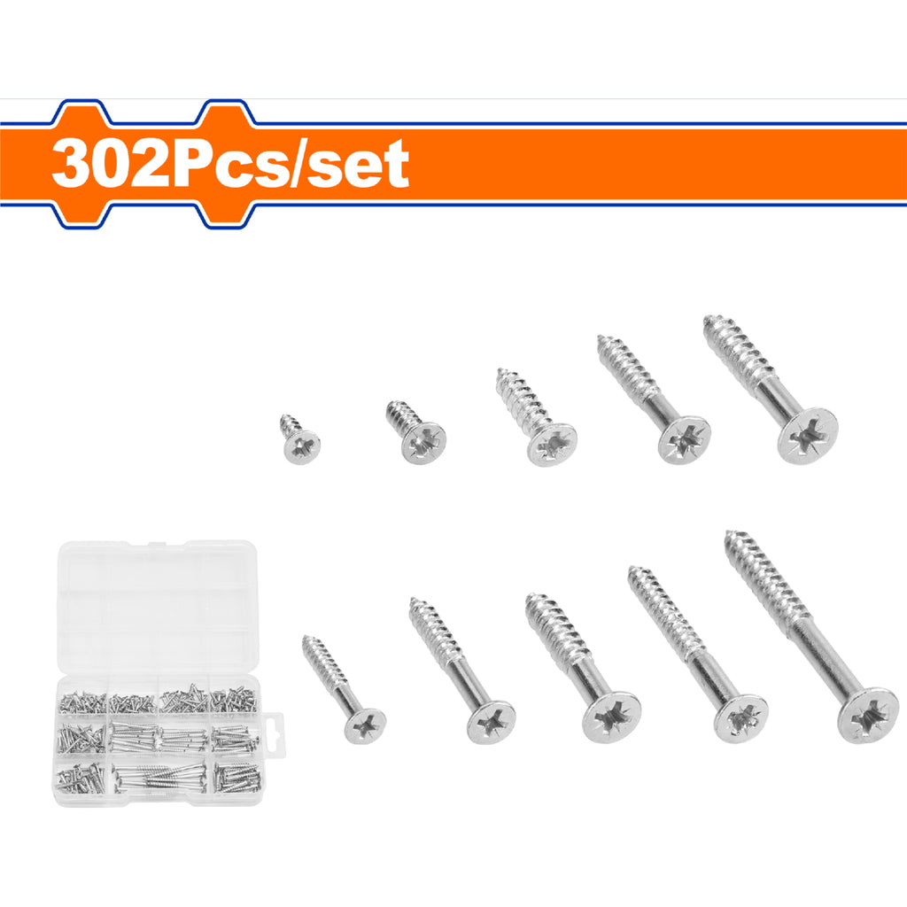 | Características | 302 piezas. Cabeza avellanada. Auto enrosca. |