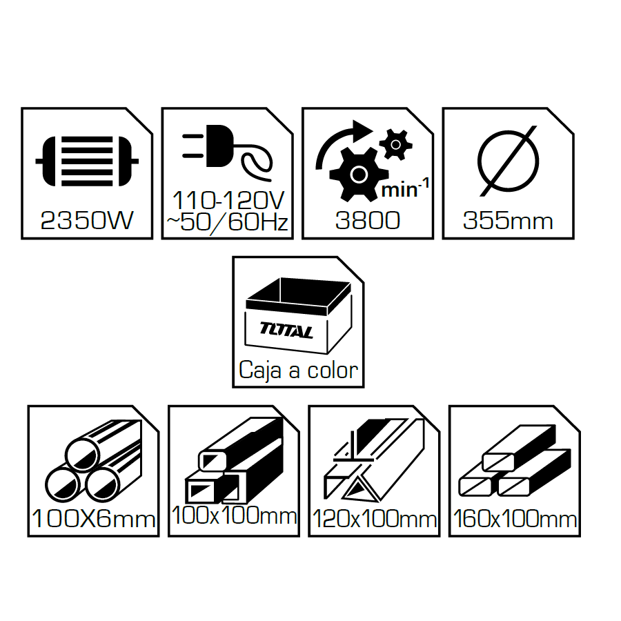 UTS9243558 Sierra Circular de 110-120V~60Hz. Potencia 2350W. Velocidad Max. 3800 rpm. Diametro de Hoja de Sierra de 355 x 25.4 x 3 mm. Capacidad de Corte en Tubos Redondos 100mm, en Acero Cuadrado 100x100mm, en Acero Rectangular 120x100mm, en Barra de Acero 30mm. Trae 1 pza de Disco de Corte de 355mm.