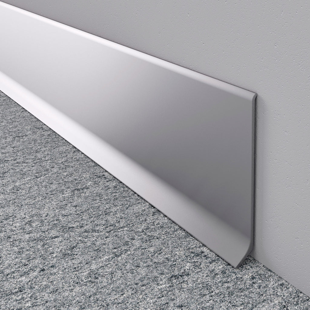 Perfil para Funcion de Rodapies. Acabado Anodizado Silver. Altura de 106.40 mm. Espesor 1.3 mm. Soporte para Instalacion con HigthTack. Largo de 5.85 mts. Material aluminio 6063-T5.